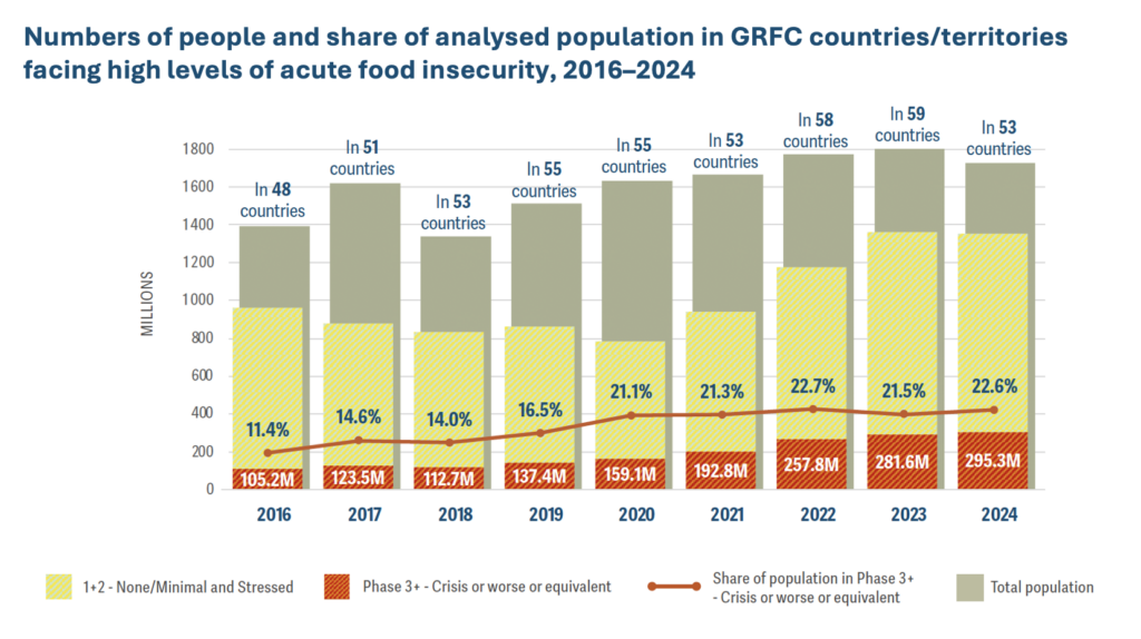 The world faced a stark inflection point in 2024, as the continued rise in the number of people facing crisis-to-catastrophic levels of acute food insecurity meets sharp reductions in funding for humanitarian assistance. The 2025 Global Report on Food Crises (GRFC), released May 16, reports that 295.3 million people across 53 countries/territories faced acute food insecurity in 2024. This represents a tripling of the number of people facing acute hunger since 2016 and a doubling since 2020 (Figure 1).