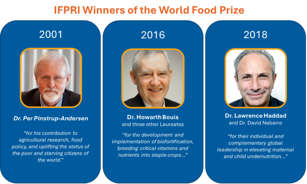 Rankings and awards provide another indicator of IFPRI’s academic reputation. The Research Papers in Economics (RePEc) database, which uses publication counts, citations, and download statistics to assess institutions, has ranked IFPRI first among agricultural economics departments every year since 2015 and first in the field of agricultural economics almost all years. IFPRI also consistently ranks highly among global think tanks, according to the Global Go To Think Tank Index. The Institute’s researchers have won numerous awards in recognition of outstanding papers, books, and presentations on timely issues or of lifetime achievements in the fields of nutrition, agricultural economics, natural resources, and more. Notable among these honors are three World Food Prizes, the premier international award recognizing individuals for their contributions to improving world food supply.