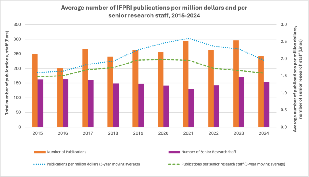In 2025, as IFPRI marked its 50th anniversary, it commissioned a review titled Taking Stock: Impacts of 50 Years of Policy Research at IFPRI to evaluate its standing as an international research institution and the influence and impact of its policy research and capacity-strengthening activities. The review drew on bibliometric data and about 45 independent assessments commissioned by IFPRI, its partners, or investors over the years.