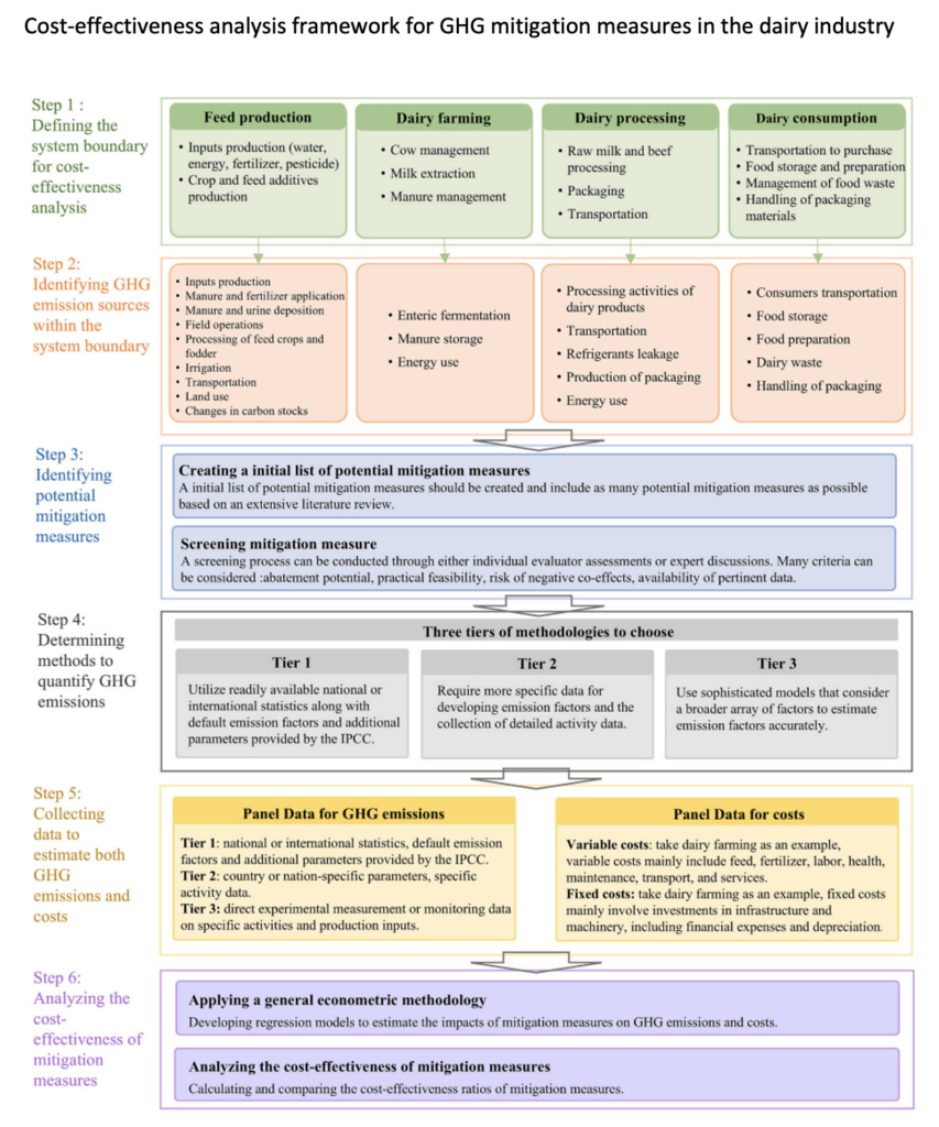 Existing research has identified several mitigation measures with significant emission reduction potential in the dairy sector, from feed production and dairy farming to dairy processing and consumption. However, the economic feasibility of these measures remains unclear. Cost-effectiveness analysis (CEA) is commonly used to identify economically efficient options for achieving specific objectives or to assess associated costs. In the context of climate change, CEA is employed to evaluate and rank the performance of various mitigation measures. While CEA has been widely applied across sectors such as electricity, building infrastructure, agricultural practices, and transportation, its application in the dairy sector remains limited. Recent studies that analyze the cost-effectiveness of GHG mitigation measures in dairy production often rely on national or regional statistics, or on average farm data collected through field surveys, to construct a standardized reference farm. This approach overlooks the significant variability that exists among individual dairy farms.
