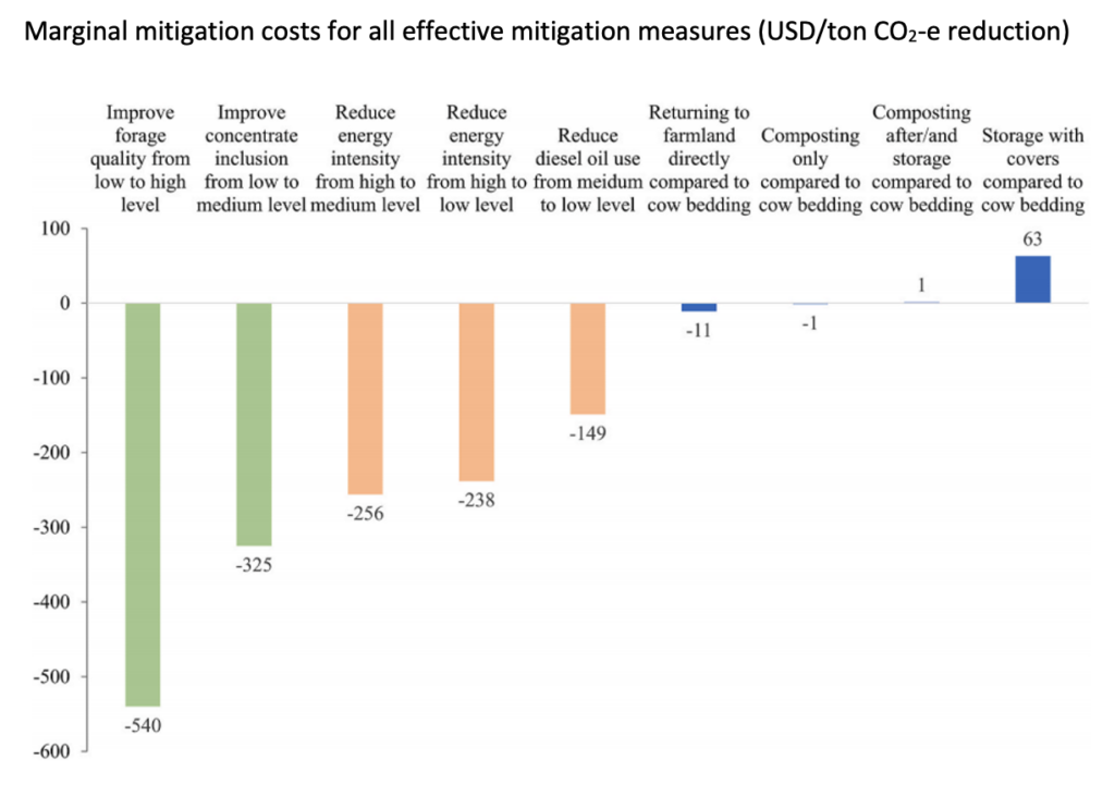 Our findings reveal highly cost-effective opportunities for GHG mitigation in dairy production. The results highlight potential measures to reduce GHG emissions across feed, manure, and energy management, with many effective mitigation measures offering both environmental and economic benefits.