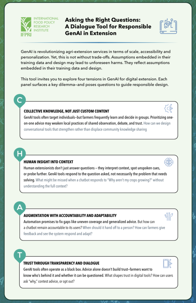 The discussions were guided by the C-H-A-T framework (Figure 1), a tool developed by IFPRI researchers based on existing digital extension literature and early evaluations of gen AI tools to surface dilemmas in achieving these goals. Participants examined the values embedded in the design of gen AI tools and examined ways that they can best be adapted for agricultural advisory.