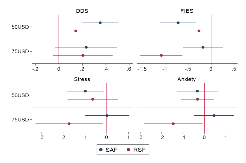 The impact of the digital cash transfer is higher among beneficiaries living in states controlled by RSF (Figure 2). The greater impact observed in RSF-controlled areas could stem from a combination of structural and contextual factors such as liquidity constraints related to the currency changes in SAF-controlled areas, increased violence incidents, and clashes. In general, RSF-controlled states had a lower baseline of food security and mental health outcomes. Thus, the same intervention generates larger marginal improvements among households living in RSF-controlled states, compared to SAF-controlled areas.