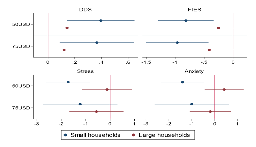 Similarly, the impact of the digital cash transfers is larger for beneficiaries with a relatively smaller household size (Figure 3). The relatively lower impact of digital cash transfers on larger households can be attributed to several factors. First, when a fixed transfer amount is distributed across larger household members, the per capita value of the transfer diminishes. This may weaken the effectiveness of the transfer. Additionally, intra-household allocation of resources can be more complex in larger households, potentially leading to less efficient use of the funds. This pattern aligns with findings from prior research, which show that the effectiveness of cash transfers tends to be lower for larger households unless the transfer size is adjusted proportionally (Ongudi et al. 2024).