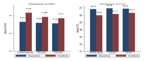 Figure 1 shows that at baseline, both control and treatment groups had comparable levels of food security. However, parallel with the evolution of the armed conflict, conditions worsened after the baseline survey, triggering deterioration in food security across all groups. Recipients of digital transfers, particularly the $75 recipients, were significantly protected and hence witnessed smaller reductions in FCS and less severe experiences of food insecurity. These results suggest that the digital cash transfers shielded households from steep deterioration in food insecurity outcomes.