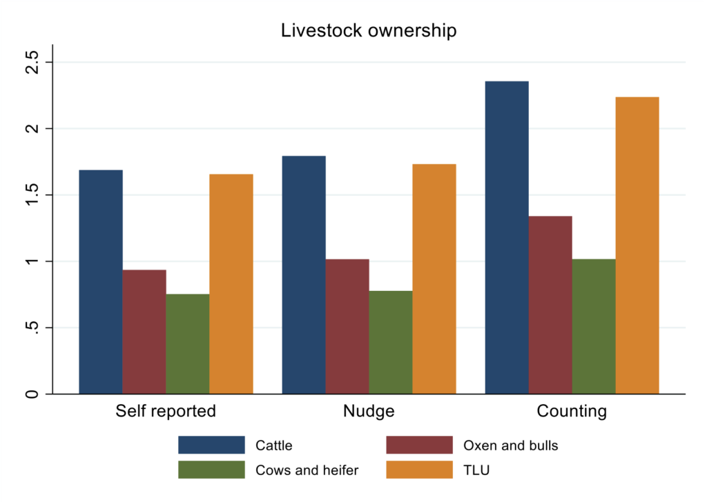 In recent research (Abay et al. 2025), we introduce a novel set of survey and measurement experiments to improve livestock statistics in Africa. First, with the aim of addressing some of the potential sources of underreporting in livestock assets described above, we introduced an explicit nudge to a random subset of survey respondents. The nudge reminds respondents that the livestock data collected will be used solely for research purposes, and not to identify beneficiaries of social protection programs or for tax purposes. This was delivered midway through the survey and just before the start of the livestock module.Second, we arrange for direct counting of livestock assets by enumerators and local livestock experts. As shown in Figure 1, we show that that self-reported data on livestock ownership suffer from significant underreporting. While the average effect of the nudge appears to be negligible (although it affects the reporting behavior of households with larger stocks of livestock), direct counting increases total livestock ownership by 39% and the reported number of cattle by 43%.