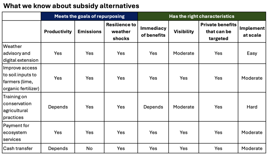 For that effort to work, those investments must share key characteristics of existing subsidies—especially to anticipate likely political opposition. More evidence is also needed on how to roll out alternatives at a national scale and how to sequence that with the withdrawal of fertilizer subsidies.