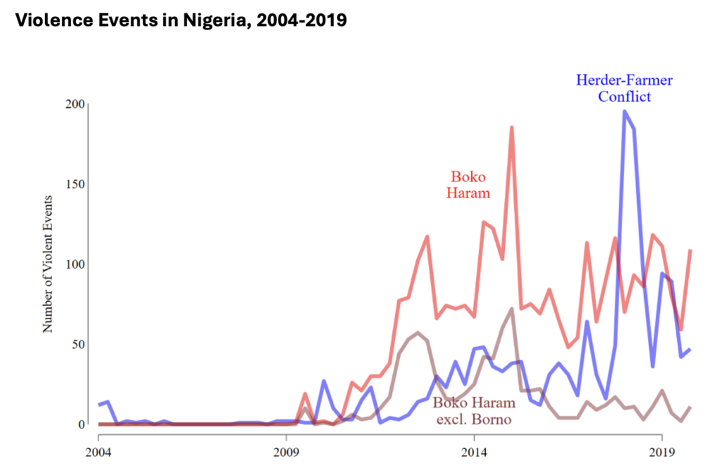 From 2010-2020, Nigeria experienced a sharp rise in violence propagated by the jihadist group Boko Haram in the northeast region and escalating inter-group conflict between farmers and Fulani pastoralists in the north-central region. Boko Haram’s violent attacks led to states of emergency in both 2011 and 2013; and while that group has dominated the news, conflicts between Fulani pastoralists and settled agricultural communities are often more deadly.
