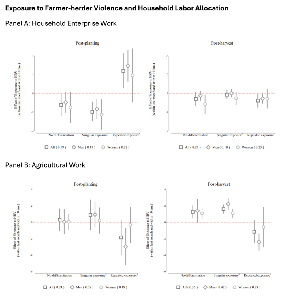 Our main results, shown in Figure 2, reveal that in the post-planting season, individuals within agricultural households exposed to a single farmer-herder violent conflict event reduce household enterprise work and do not change agricultural work.