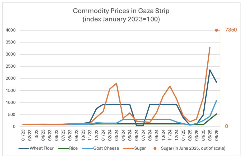 Previous price jumps have corresponded with periods of reduced food inflows. Prices have dropped once restrictions on aid were lifted: In summer 2024, after Israel relaxed border controls in response to heavy international pressure, and in early 2025 during the three-month ceasefire.