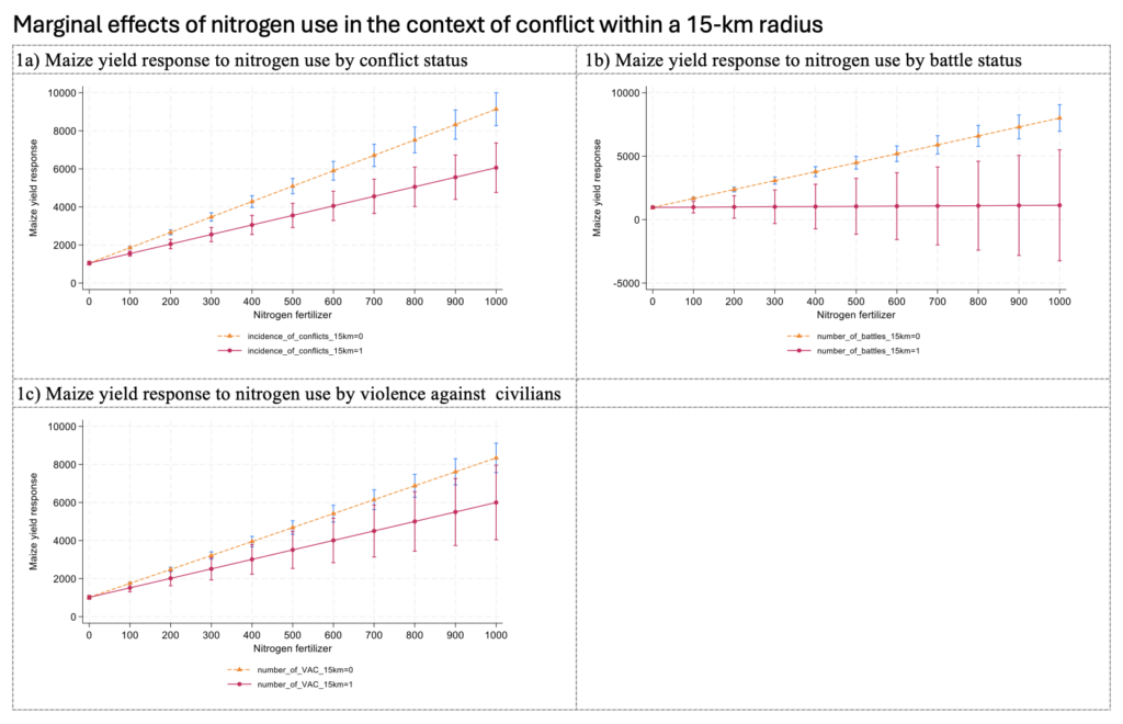 Our results reveal a clear message: conflict makes fertilizer less effective. When farmers apply more nitrogen fertilizer, maize yields generally increase. But this boost is much smaller for farmers living within 15 km of conflict events, whether general conflict, battles, or violence against civilians. As shown in Figures 1a-1c, farmers in peaceful areas see much steeper improvements in yield when they use more fertilizer. Those exposed to conflict, however, experience flatter responses, meaning the fertilizer simply doesn’t deliver the same benefits.