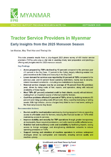 2024Boughton, Duncan; Belton, Ben; Lambrecht, Isabel B.; Masias, Ian; Minten, BartThe Myanmar Strategy Support Program (Myanmar SSP) aims to enhance the national capacity to conduct research and prioritize strategic reforms that improve food security and nutrition in Myanmar. Through a multi-faceted and multidisciplinary research program designed to anticipate and monitor the impacts of multiple crises on household welfare and the agrifood system, Myanmar SSP provides rapid assessments that inform programming and investments for development partners, civil society, and the private sector. Moreover, working collaboratively with national researchers in academic institutions, it aims to fill the knowledge gap on the agrifood system, while developing the technical capacity of the next generation of national leaders to conduct research, strategic analysis and promote evidence-based policy making to support agricultural transformation and other broad development goals in Myanmar.