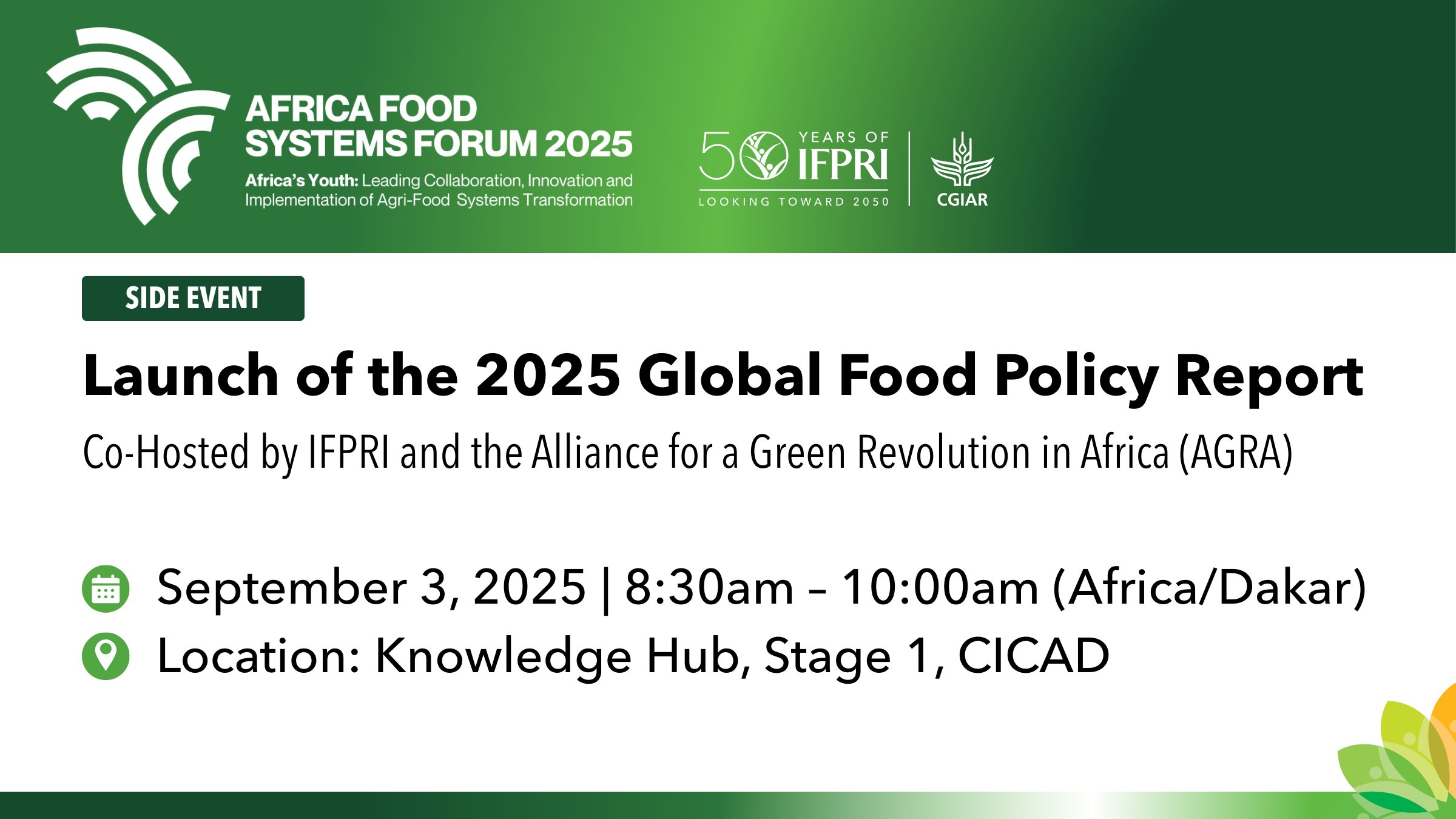 IFPRI and AGRA will host a high-level Africa launch of IFPRI’s 2025 GFPR, “Food Policy: Lessons and Priorities for a Changing World,” at AFSF, highlighting linkages to the new CAADP agenda.